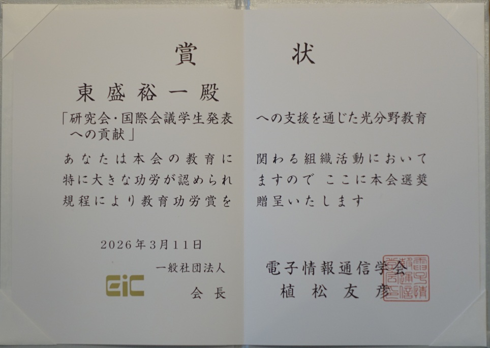 植松・電子情報通信学会会長より賞状を頂きました。