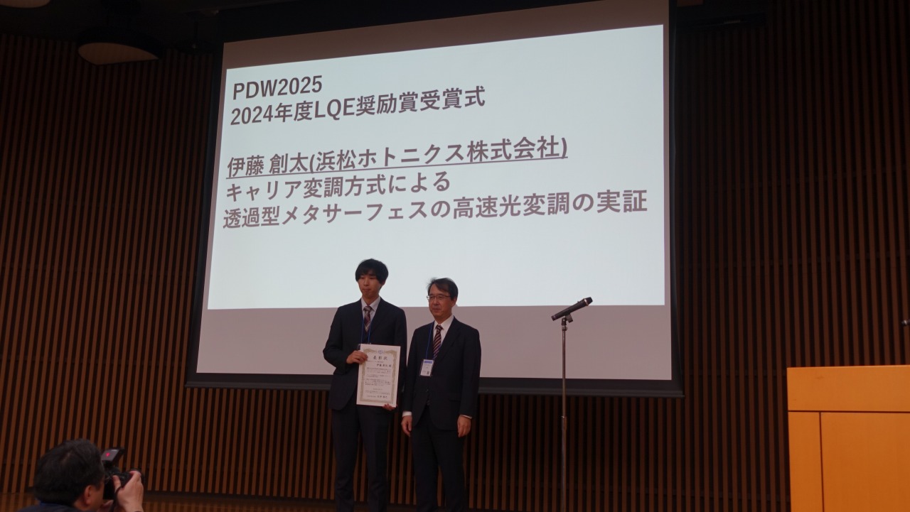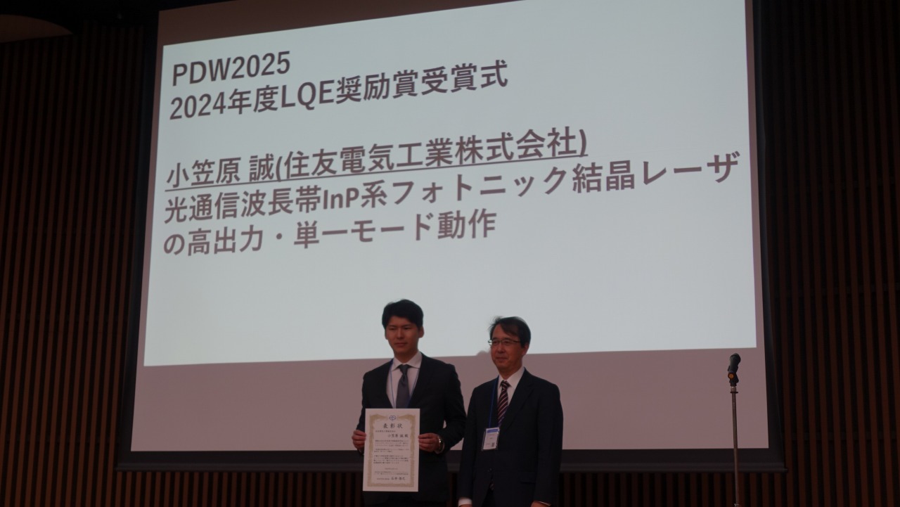 LQE奨励賞の表彰式が行われ、伊藤創太氏(浜松ホトニクス)、小笠原誠氏(住友電工)が奨励賞を受賞しました。